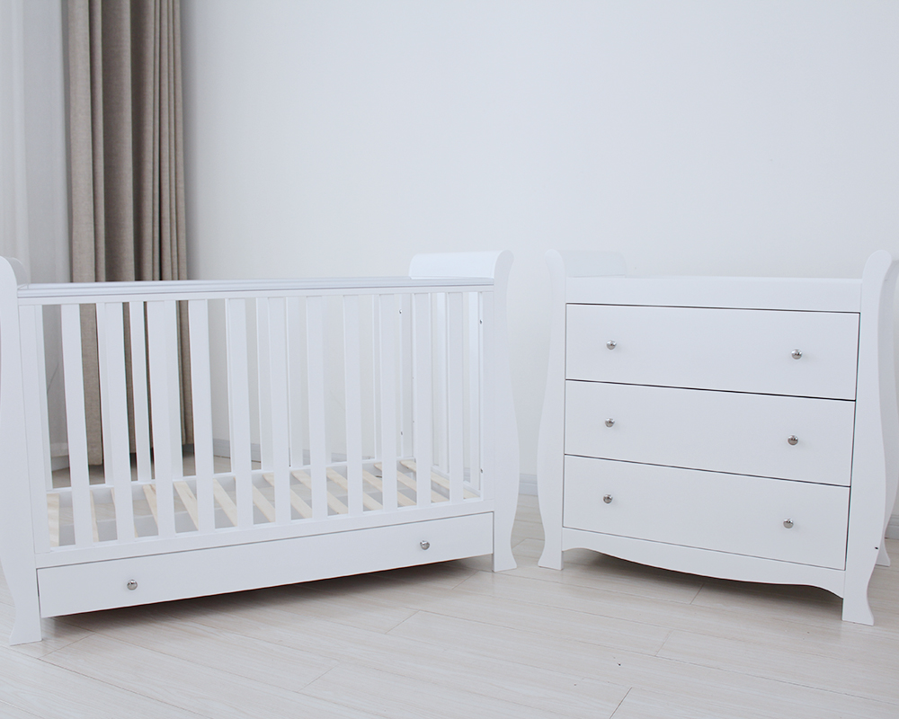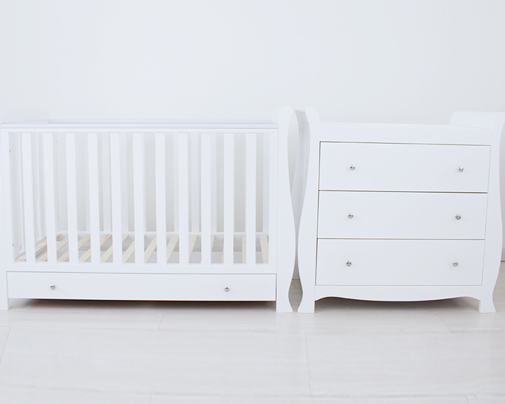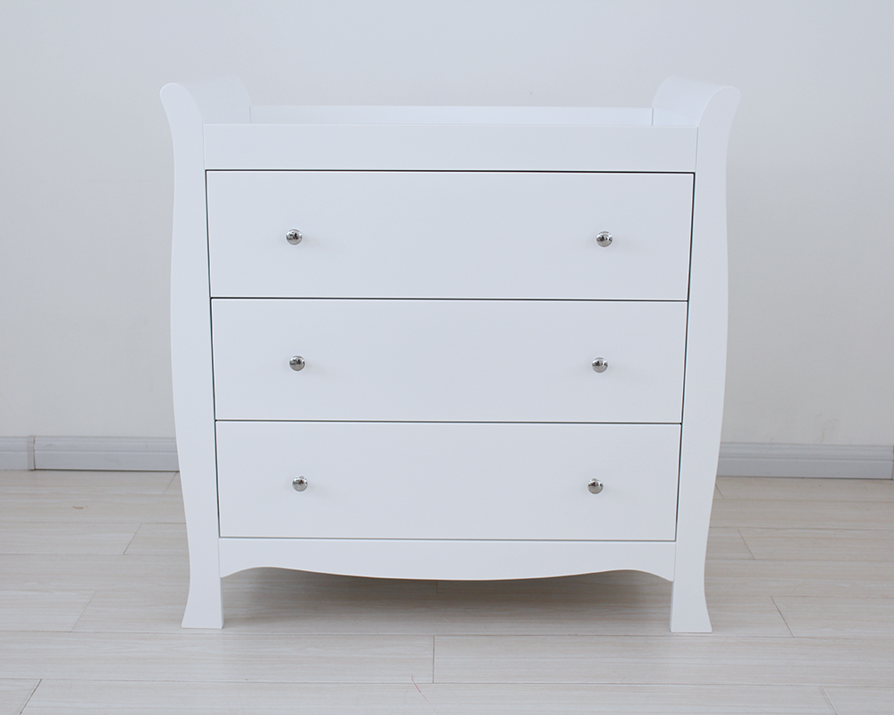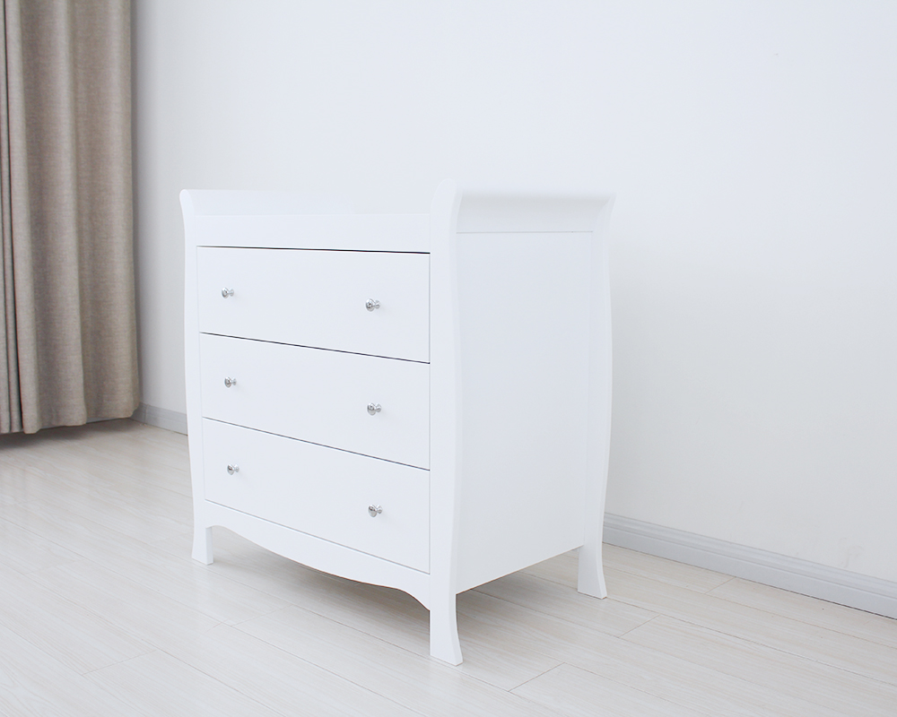 The perfect addition to your fairytale nursery, this white three-drawer dresser and changing table. A classic curved design with a modern look, function and style that will transform your nursery. Providing style, storage and practicality, this classic shape with 3 spacious drawers and a removable changing table will give your modern nursery a fresh look. Built to last with care.