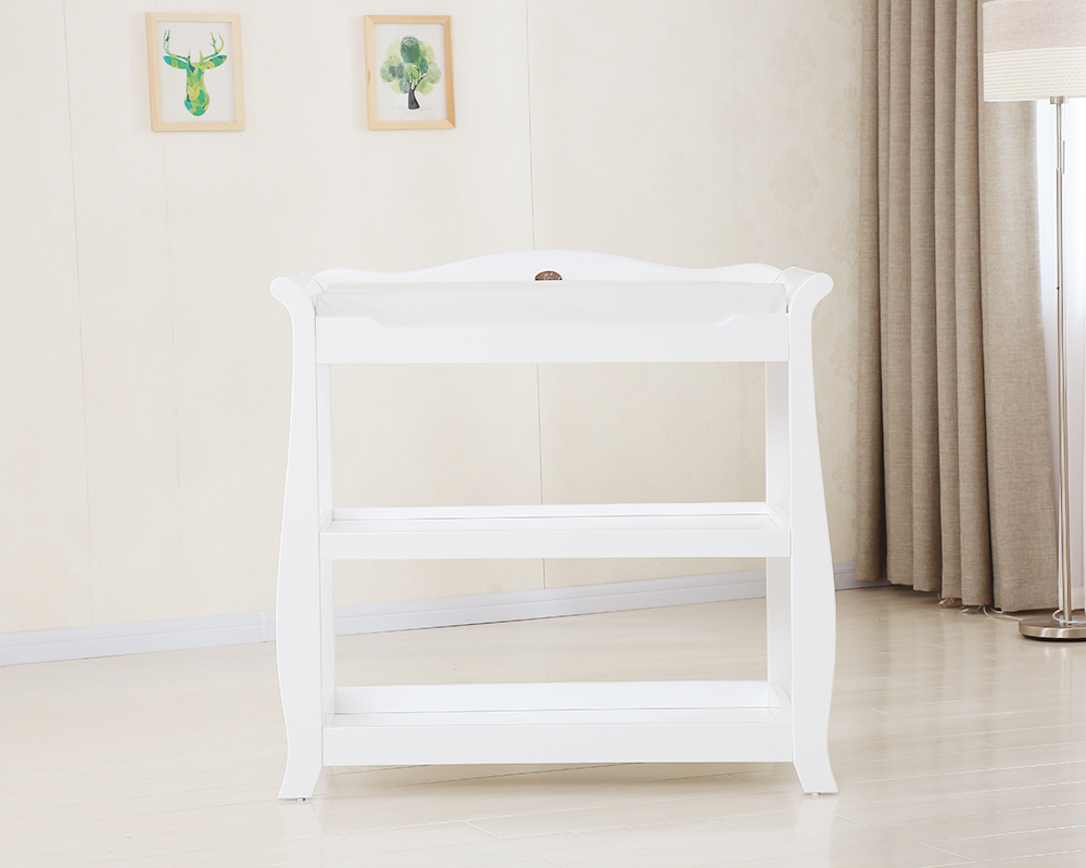 Baby changing station. Open quick-access design. Two spacious open shelves. Space for a changing pad on top. Elegant sled-style design. Available in multiple colors. Whether you need quick access to essentials for a burst diaper or just need to prepare a diaper change for a nap, this open changing station has you covered. It's designed with two spacious shelves to stack diapers, extra clothes, creams and ointments, toys, towels, and other essentials.