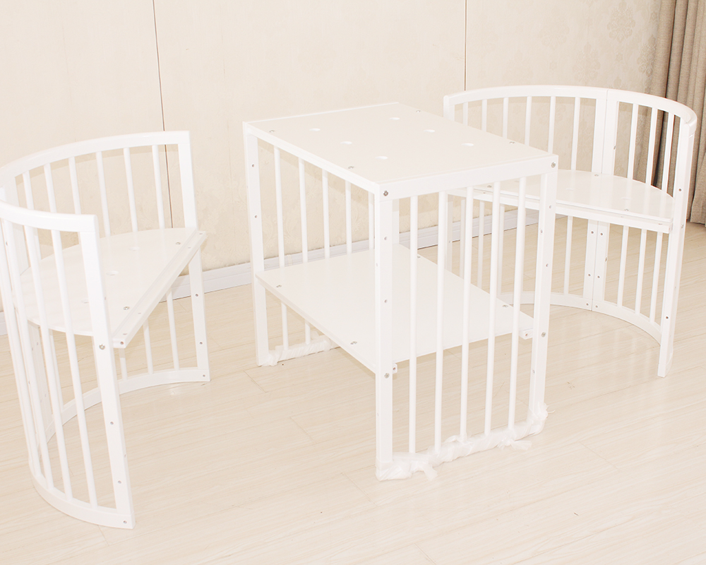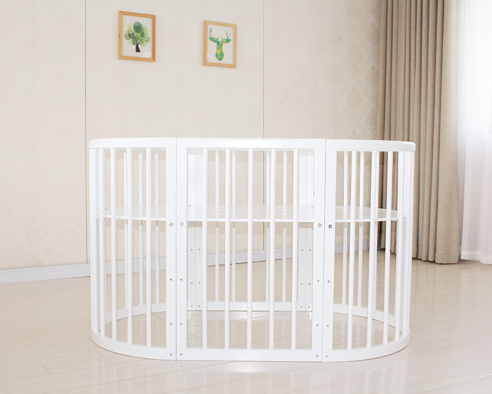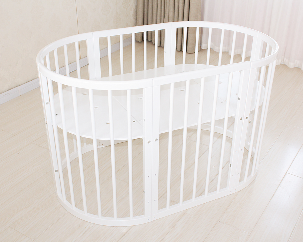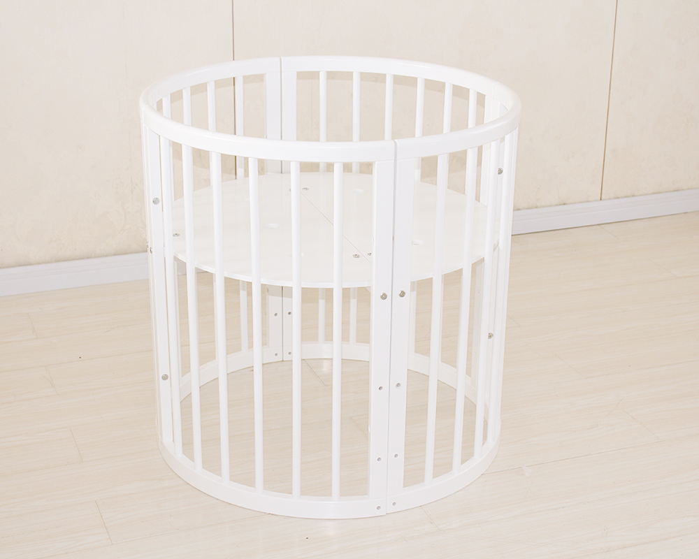 This innovative round baby crib features a modular design that grows with your child. It can be easily assembled and transformed into a cradle, infant crib, toddler bed, or even a bench. Equipped with wheels, it offers flexibility and mobility throughout the home. Its smooth white finish and curved lines bring a modern touch to any nursery while ensuring safety and functionality.