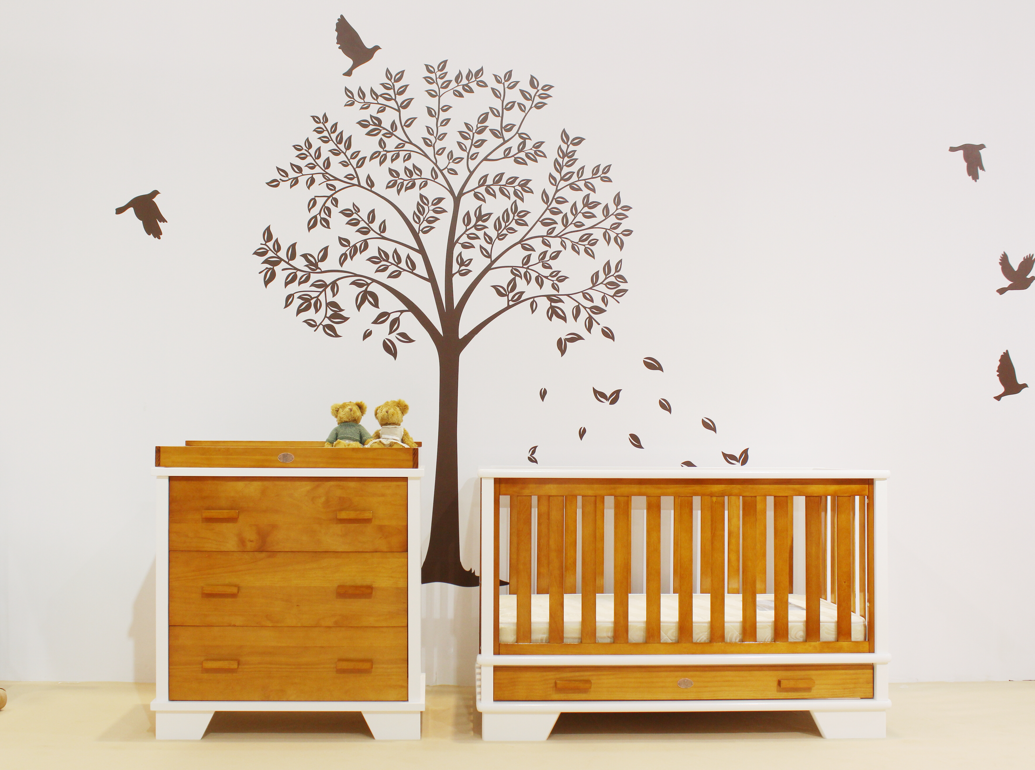 The set features an attractive two-tone color scheme and is finished with non-toxic, low-VOC (volatile organic compound) paint. Designed to grow with your baby, the crib converts to a toddler bed, and the changing table detaches to create a separate storage unit.